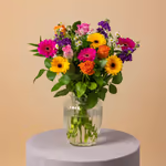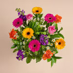 Featuring a playful mix of brightly-coloured germini stocks and roses, dotted with natural foliage; this bouquet is a burst of sunshine no matter the weather. Delivered artistically arranged for added wow-factor, your product will arrive in an eco-friendly gel-bag to ensure freshness. Wash off the gel and cut 3cm off the stem before arranging in your chosen vase.
